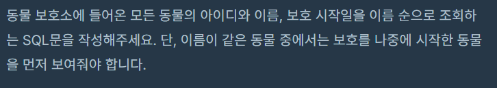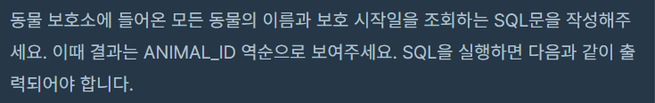 별거 없다. 이름이랑 보호시작일(DATETIME)을 조회하면 된다. 다만 역순이므로 DESC를 붙여주자.