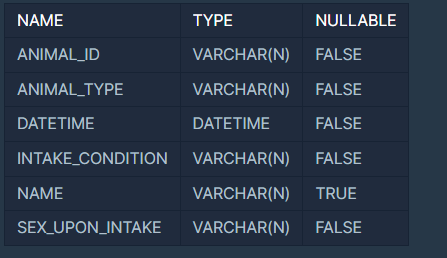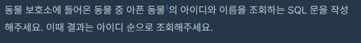 아픈 동물의 아이디를 가져온다. 아픈동물의 상태는 INTAKE_CONDITION이 SICK인 경우를 뜻한다고 추가설명이 되어있다. WHERE절을 쓰면 될 것으로 보인다.