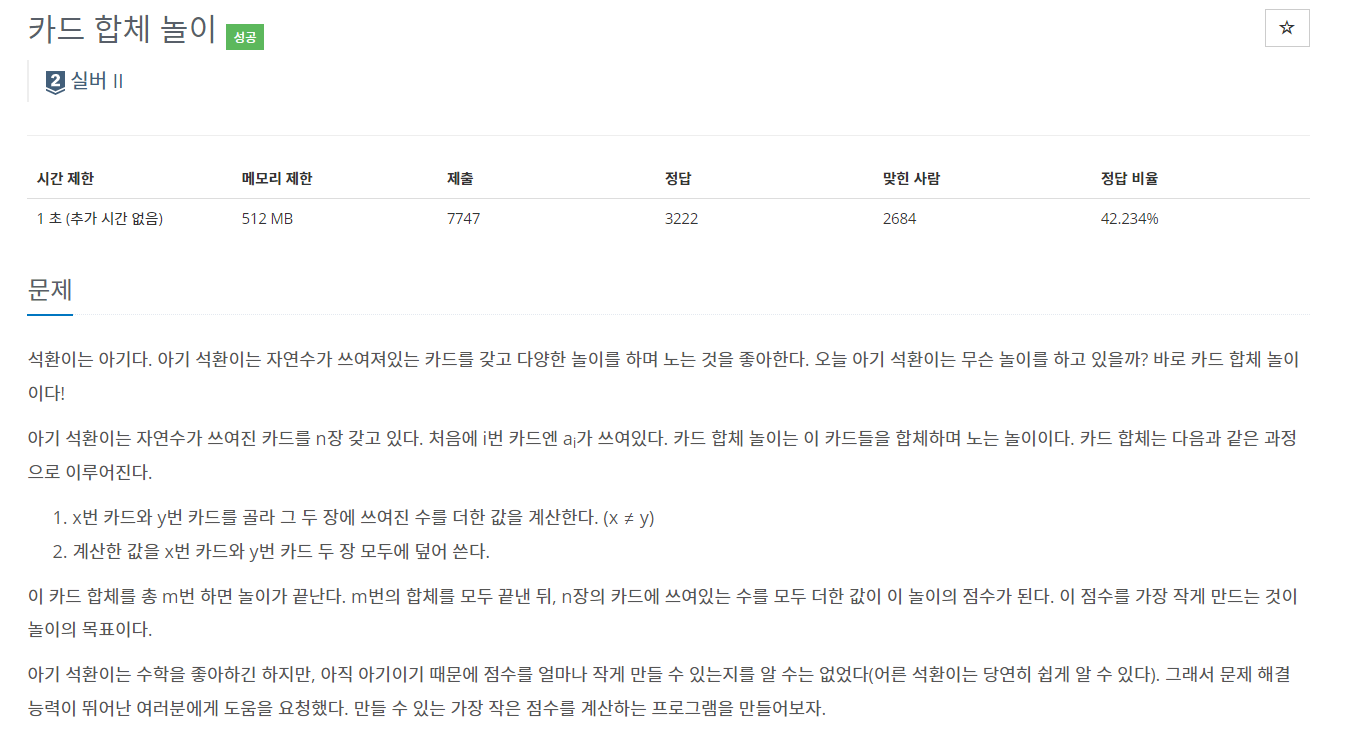 최소 힙을 사용해서 제일 적은 값을 두번 꺼내어 둘을 더하여 힙에 다시 추가해준다.
