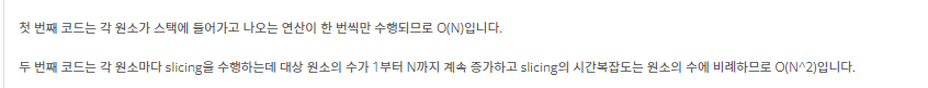 stack을 슬라이싱으로 받았고, 그에 따라 시간복잡도가 O(N^2)이 되어 시간 초과가 나타났다.