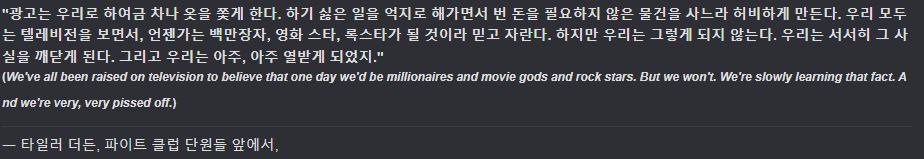 타일러 더든 이전의 사람들은 소비주의라는 관점아래서 살았다. 모두가.