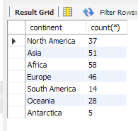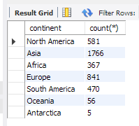 위와 아래의 코드는 거의 비슷한 코드로, 위는 대륙별로 컬럼의 갯수를 표현한 것이고, 아래는 대륙별 도시 수를 표현한 쿼리문이다.