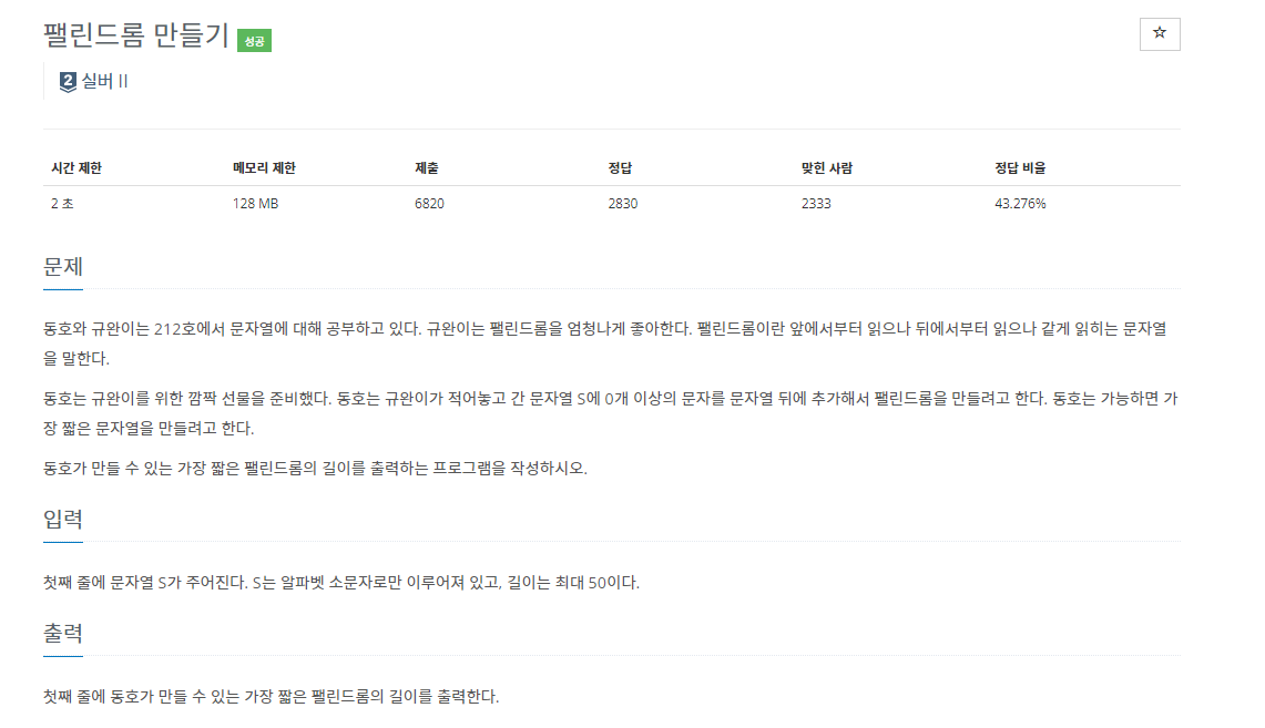 팰린드롬 문자열이므로 시작문자열의 인덱스+총 문자열의 길이를 출력해주었다.