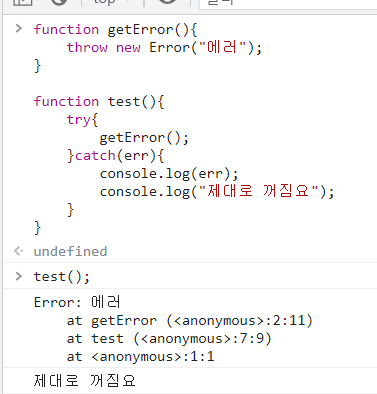 이러면 Error가 throw된 후에 test함수에서 해당 Error를 잡아서 console로 찍은 후에 제대로 꺼짐요 라는 문자열을 출력하고 함수가 종료된다.