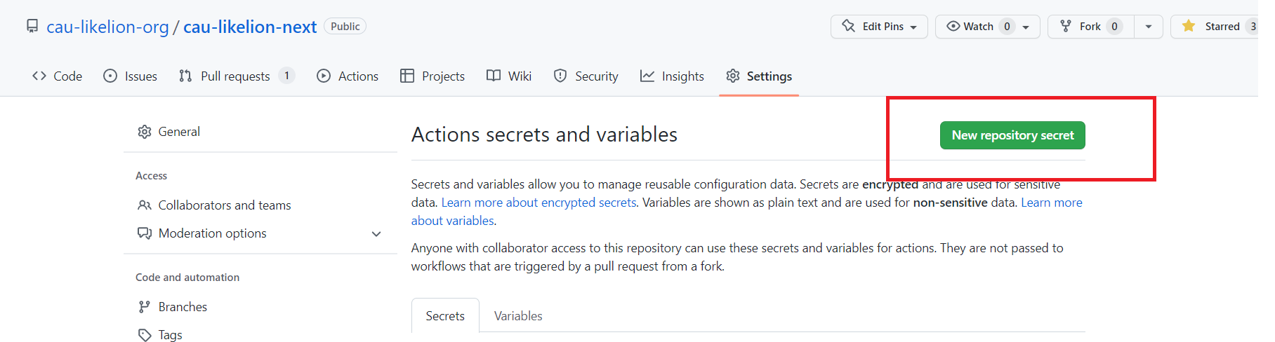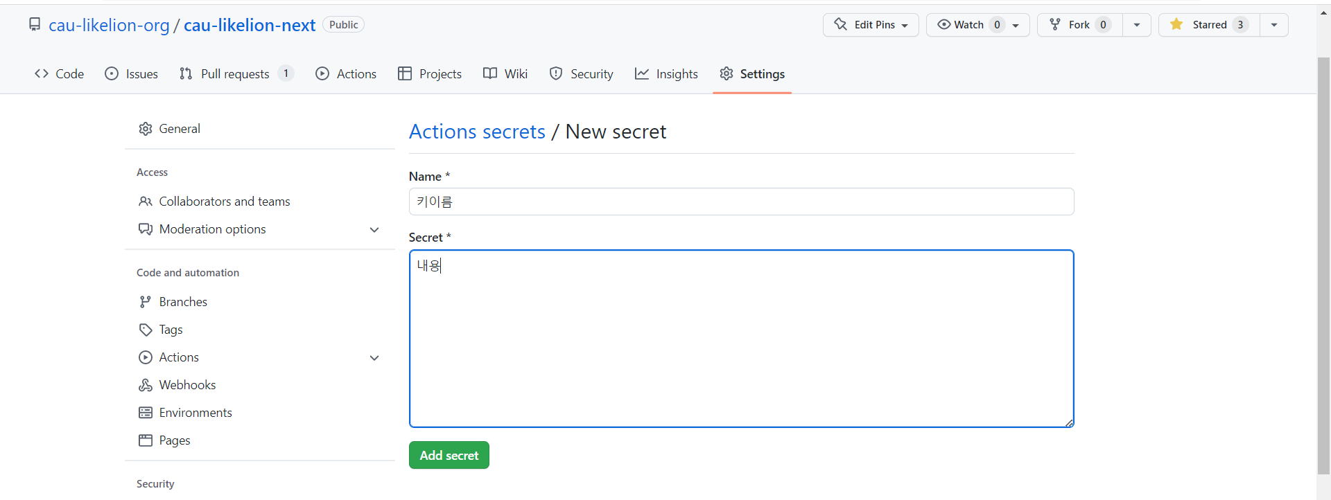 이를 github 레포의 setting>Secrets에 가서 등록해준다.