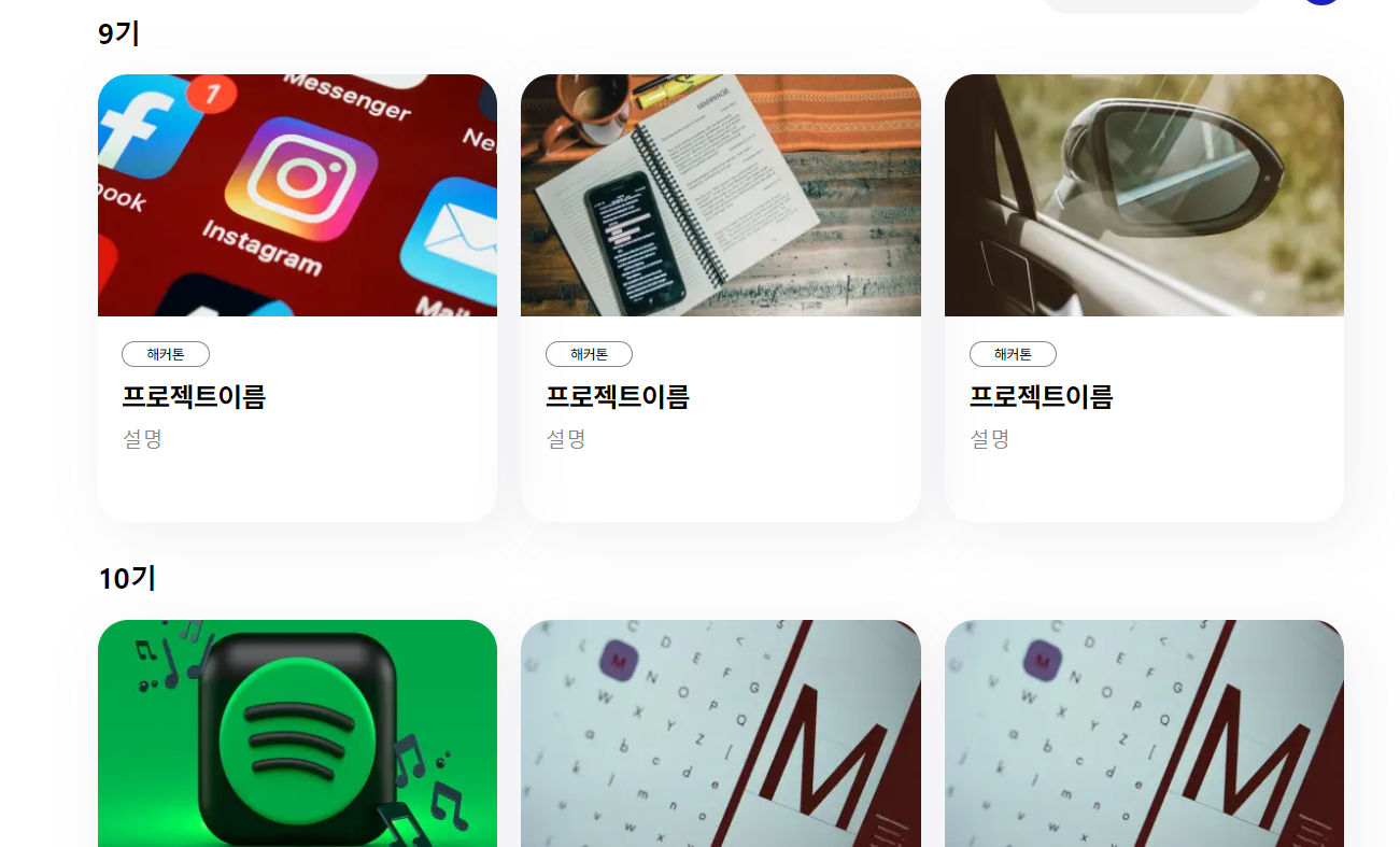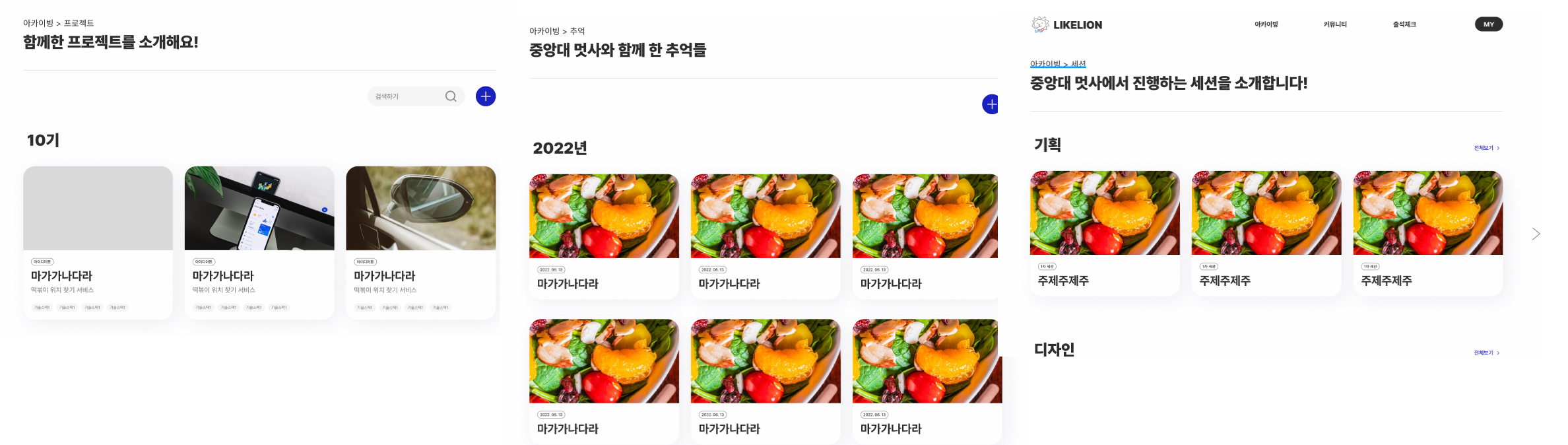 멋사사이트를 만드는 중 , 다음과 같은 3가지 아카이빙 페이지(프로젝트 아카이빙, 추억 아카이빙, 세션 아카이빙)을 제작해야 했다.