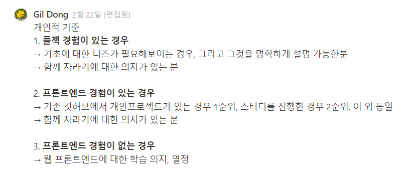 무경험자, 유경험자, 프로젝트 경험자로 크게 분류하고, 각 지원자의 깃허브에서 작성해준 코드를 기반으로 기술질문을 만들었다. 정말 많은 시간을 투자해야했지만, 그만큼 지원자 분들의 의지와 열정을 느낄 수 있었던 것 같다.
