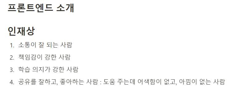 그러다보니 프론트엔드의 인재상에 아무래도 소프트웨어 장인, 함께자라기의 영향이 많이 들어갔던 것 같다.