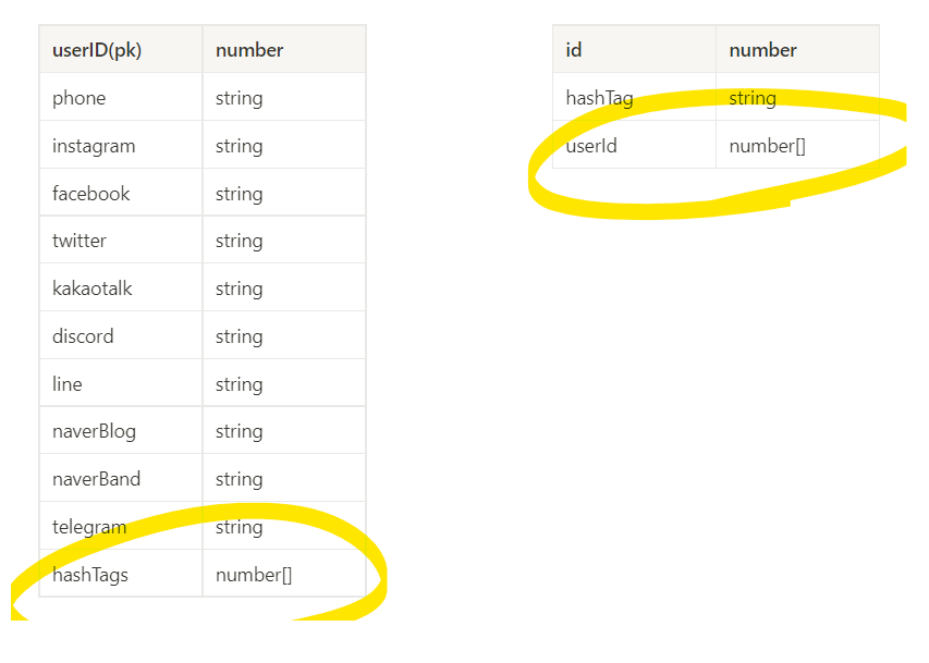 이를 위해서 처음에는 User와 HashTag테이블에 각각 HashTags, Users라는 컬럼을 만들고 배열형태로 저장하려고 했다.