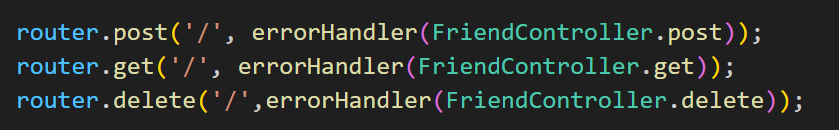 이 에러 핸들러가 모든 컨트롤러에서 작동할 수 있도록 아래와 같이 router세팅부분에서 컨트롤러 함수를 감싸준다.