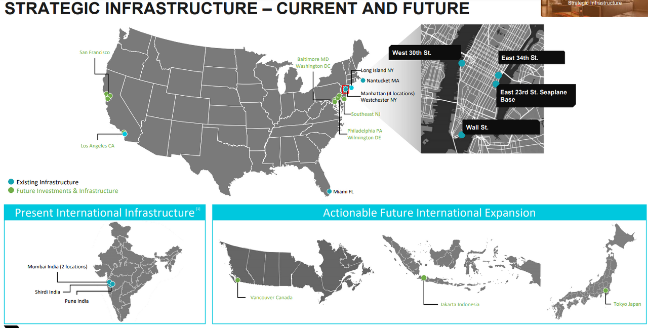 인도와 미국에 라운지와 헬기 운영장이 10개 있지만 캐나다와 인도네시아, 일본으로 진출할 계획을 가지고 있다.