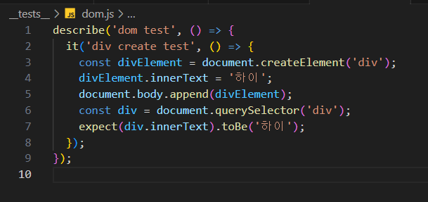 jsdom : 외부 라이브러리를 테스트코드에서 쓰는건 아닌 것 같음