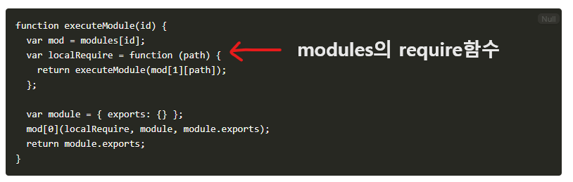 이러면 entry파일을 실행시키기만 하면 executeModule이 재귀적으로 호출되면서 모든 의존성 파일이 modules객체에서 찾아지고, 수행된다.
