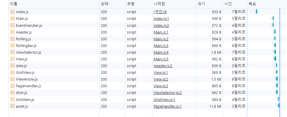번들링 없이 ESM만을 사용해 만든 프로젝트의 경우, 이런식으로 모든 js파일을 http요청을 통해 받아오는 것을 확인할 수 있다.