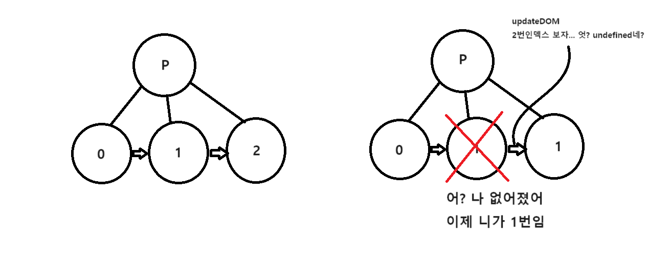 3개의 요소가 있는 상태에서 중간 요소가 사라지는경우 인덱스가 하나 밀리며 2번 인덱스의 요소가 무조건 undefined가 되는 문제가 생기는 것이다.