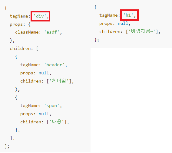 이 컴포넌트들은 createElement에 의해 각각 아래와 같은 객체로 변환된다.