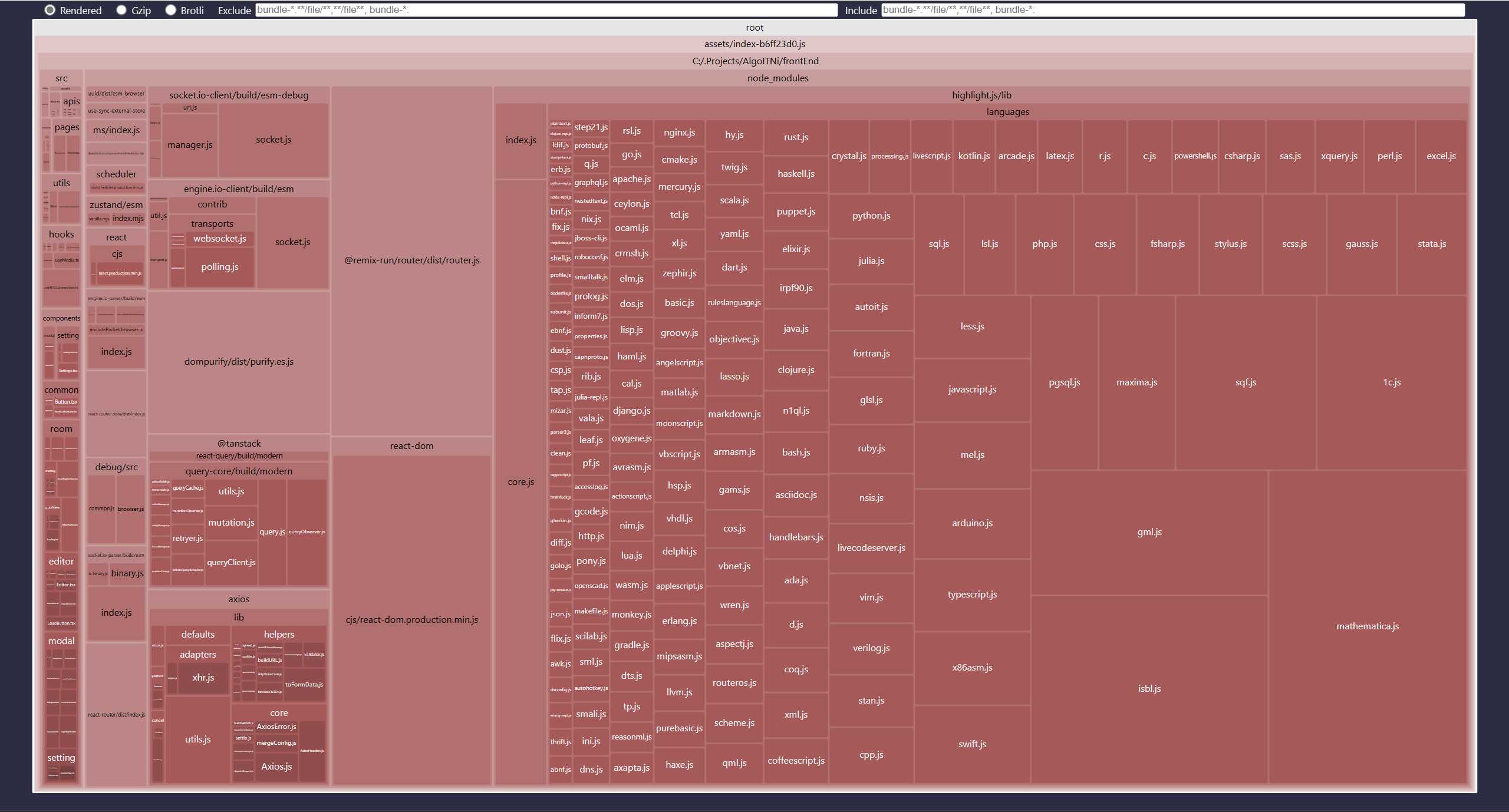 이전의 청크를 시각화하면 이랬다. highlightjs라는 코드 하이라이팅 라이브러리를 사용했는데, 여기서 사용하지 않는 언어에 대해서도 번들링이 되었기때문이었다.