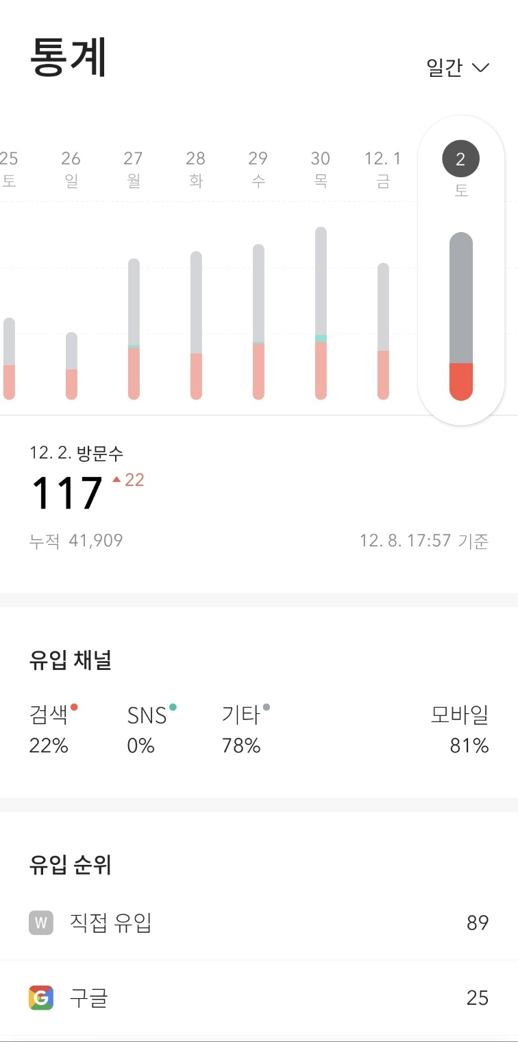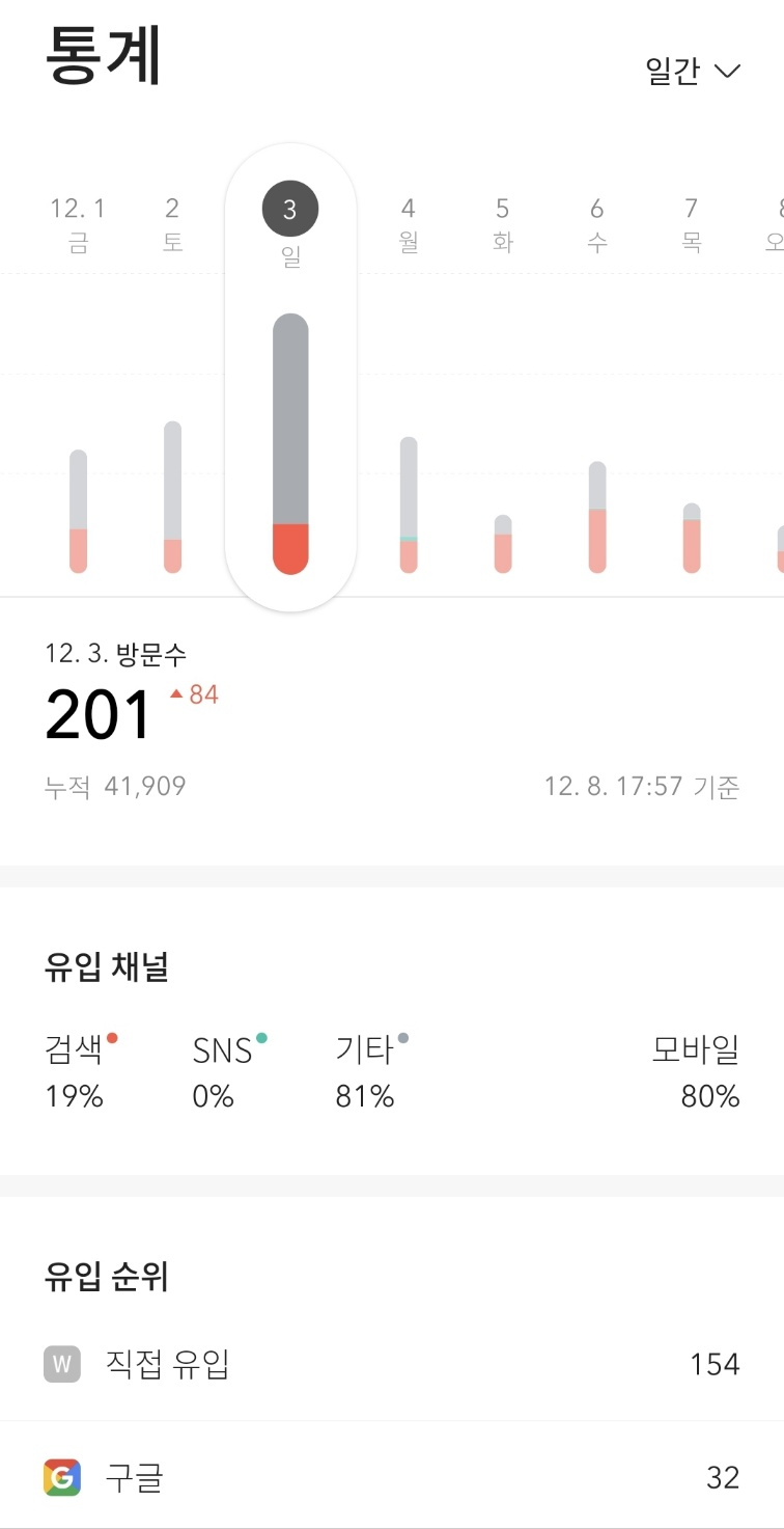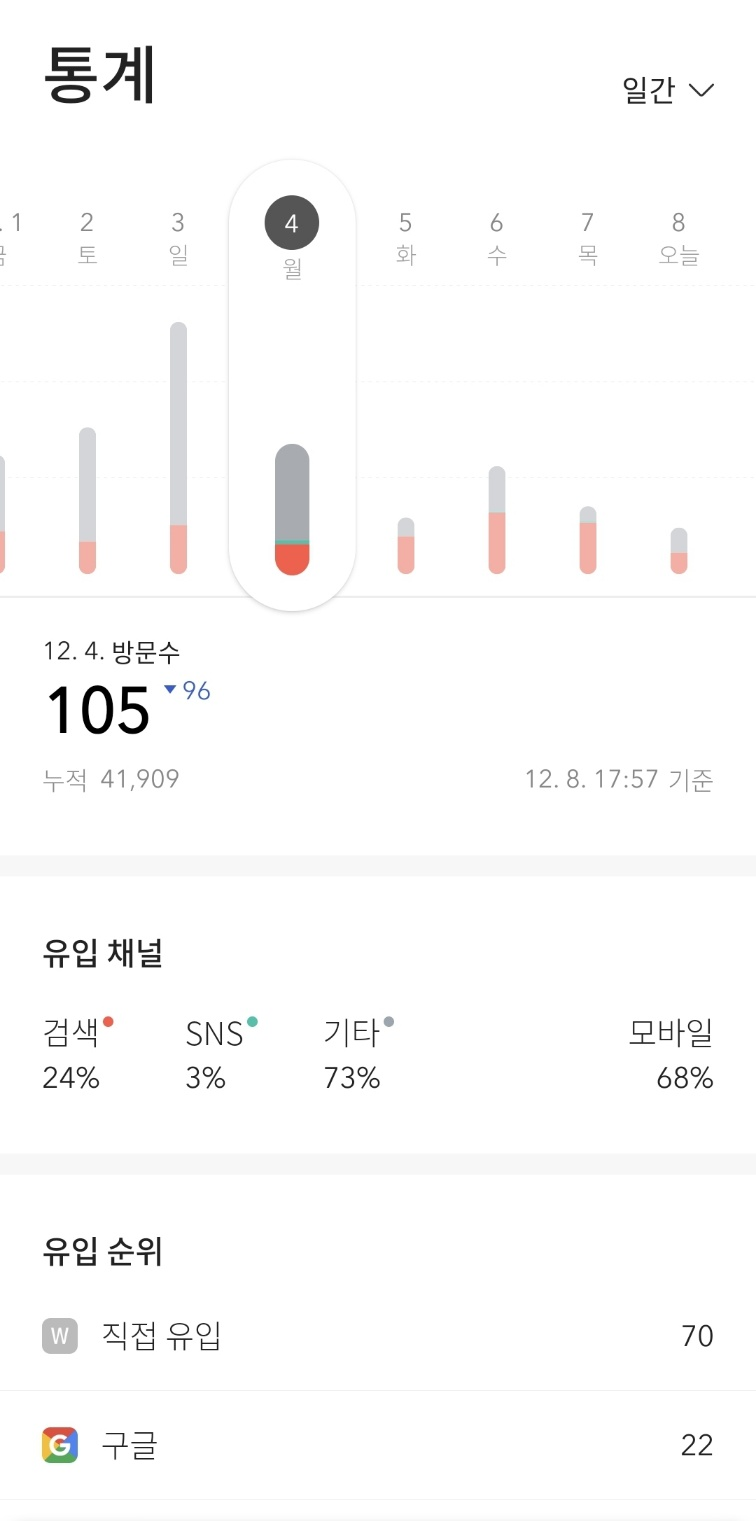 5일날 발표가 났는데, 직전까지 블로그 직접 유입이 굉장히 높았고, 발표 날부터 급격히 블로그 유입이 줄었기 때문이다.