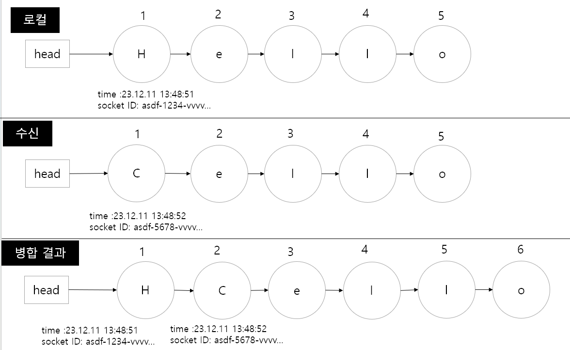 - 여러 사용자가 사용할 수 있으므로, 여러개의 병합 상황과 서로 시간대가 다른 메시지가 있어도 동일하게 병합되어야한다.