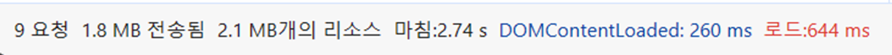 1.8MB의 크기를 불러오고, 화면에 그리는데에 644ms만큼 시간이 필요한 것을 확인할 수 있다.
