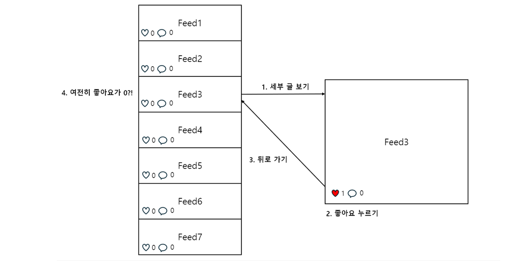 - 세부 글보기에서 좋아요/댓글을 추가/삭제하는 경우 피드데이터는 어떻게 최신화 되어야 하는가?
