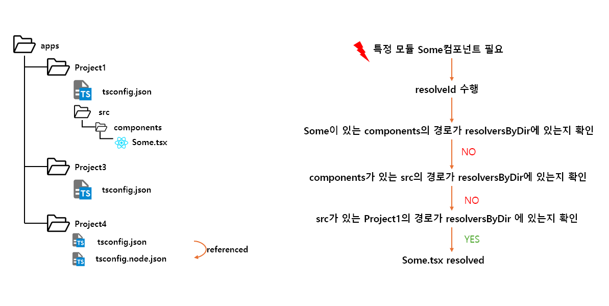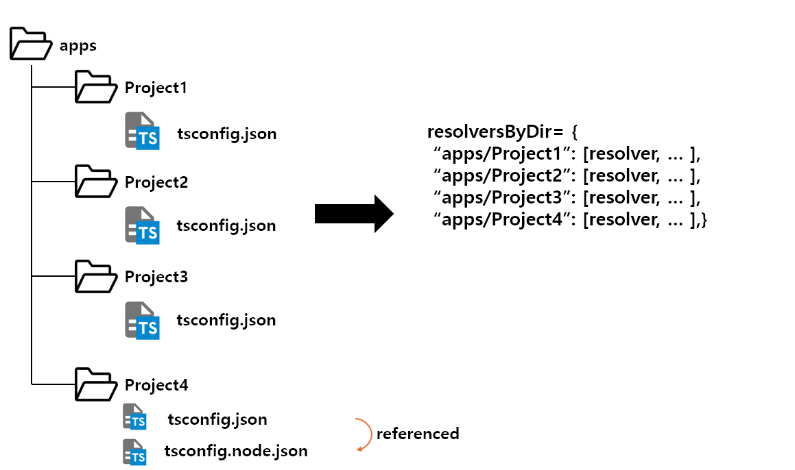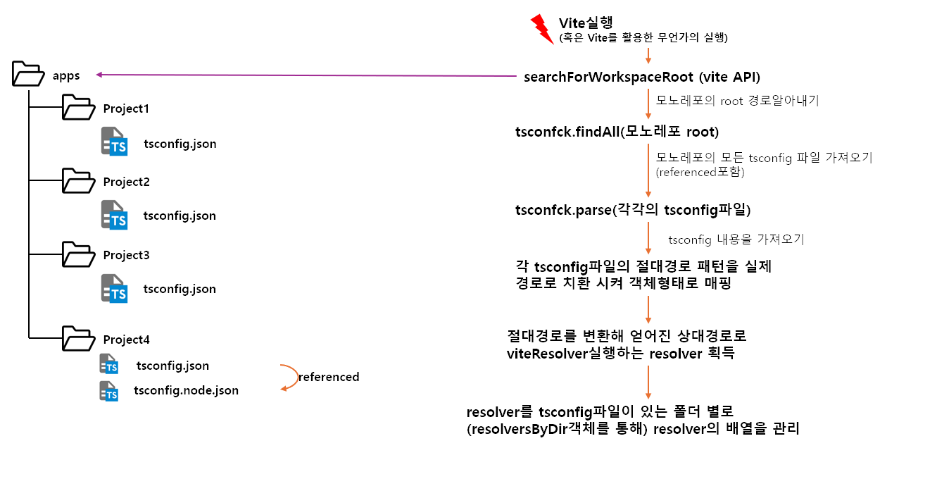 1. Vite 서버가 실행되면 configResolved가 수행되며, 이때 아래의 그림 과정을 통해 모노레포에서 tsconfig에 따라 모듈 상대/절대경로를 정해주는 resolversByDir 객체를 만들어둔다.