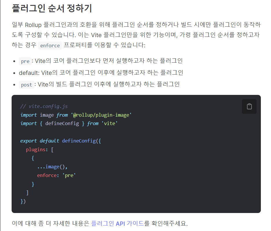 enforce는 Vite코어 플러그인보다 먼저 실행할지, 이후에 실행할지를 결정지어준다.