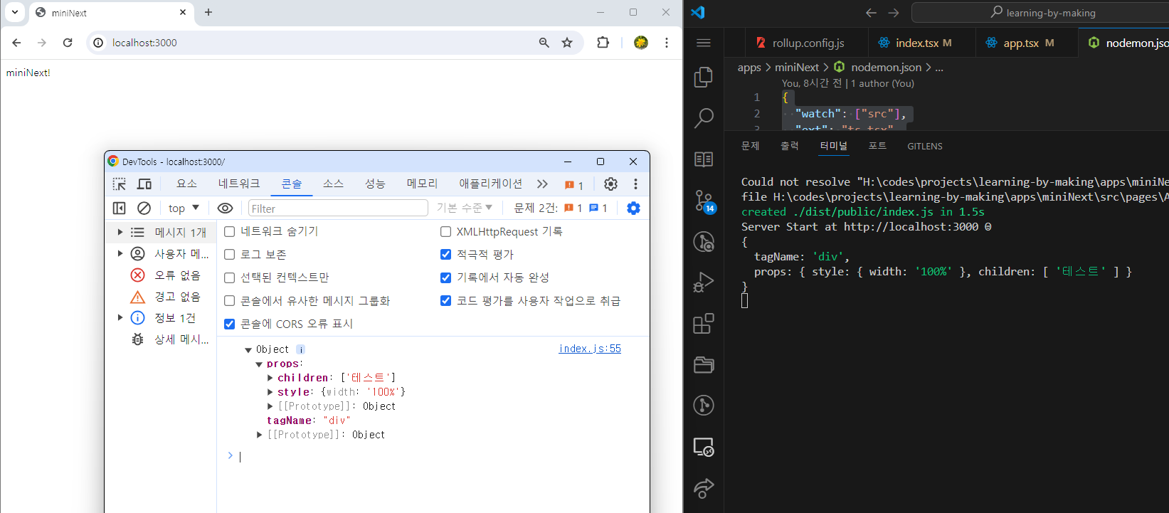 이때 번들링에 사용될 index.tsx에서 JSX를 사용하고, 이게 최종적으로 잘 작동하는지 확인해 보면 JSX컴포넌트는 서버와 클라이언트에서 모두 호출가능한 형태인 것이 된다.
