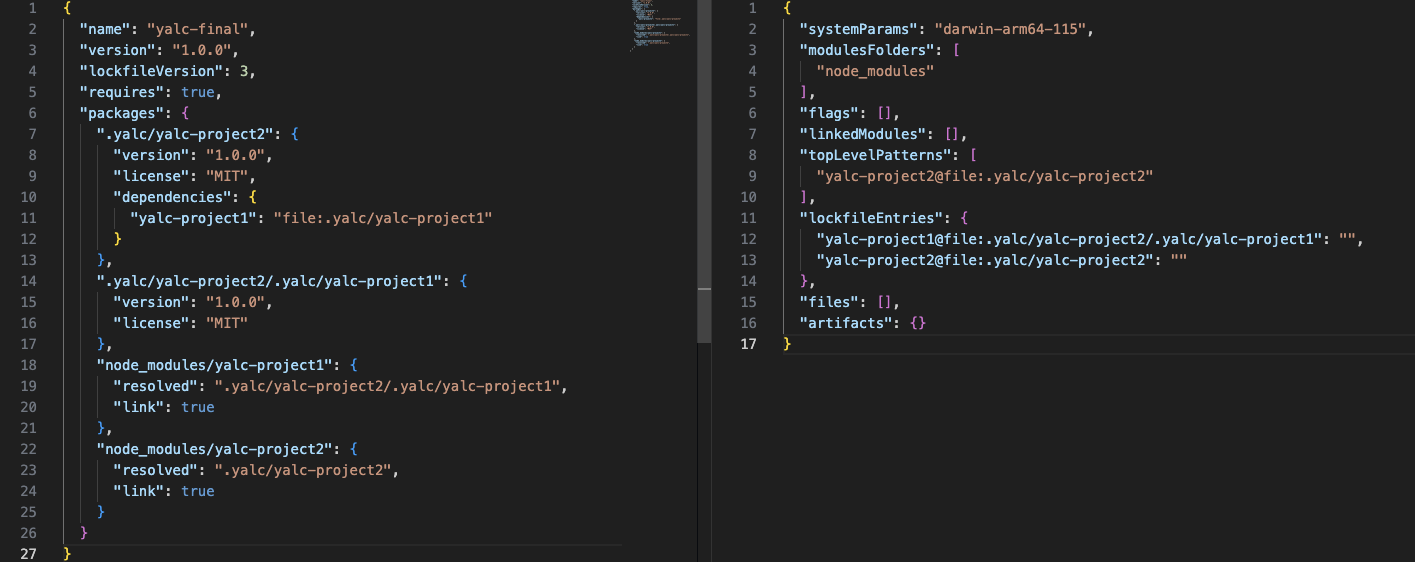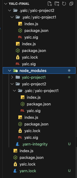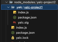 이 상태에서 yarn 또는 npm install을 해주게되면 node_modules/yalc-project1디렉토리가 생성되며, node_modules에 병합을 해주는 파일(.package-lock.json, yarn-integrity)이 생성된다.
