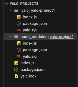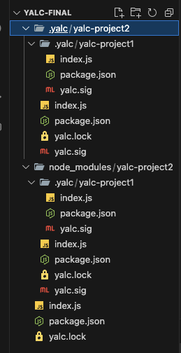 그럼 이제 .yalc에 yalc-project2가 생기고, yalc-project2 프로젝트에 .yalc/yalc-project1이 추가된 것을 확인할 수 있다.