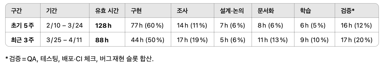 지난 3주간 그래도 이전보다는 설계/논의, 문서화 비율이 많이 올라왔다.