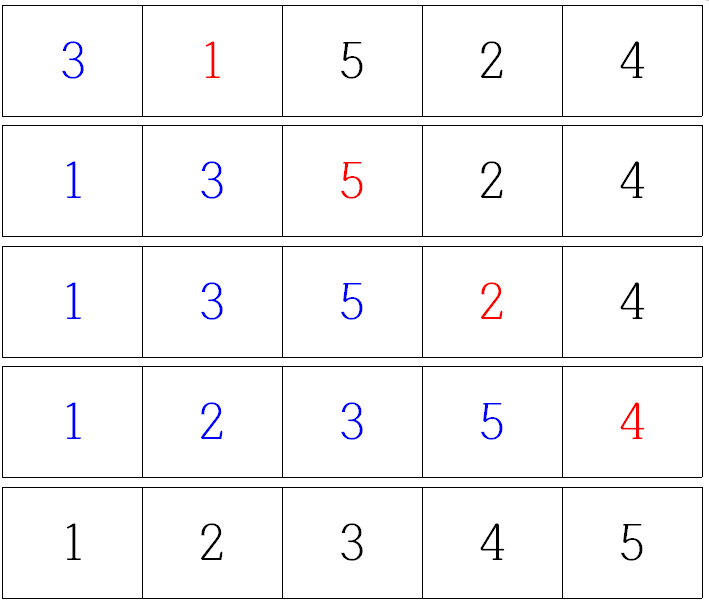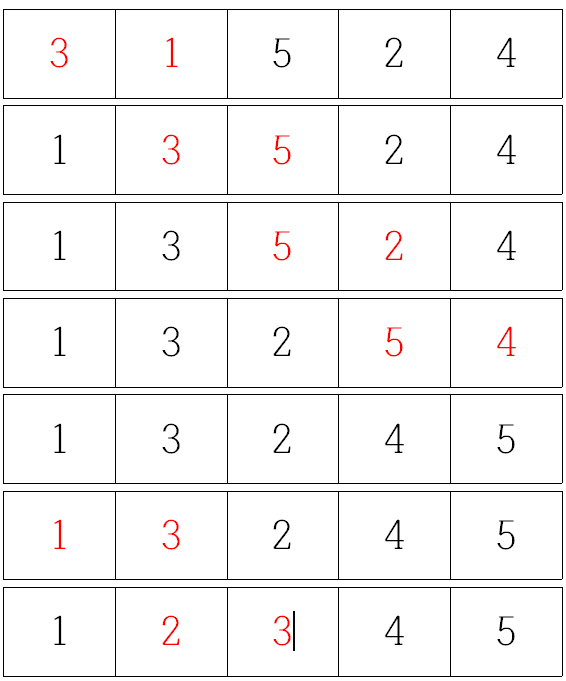 현재위치에서 이하의 배열을 비교, 자신이 들어갈 위치에 들어가는식으로 정렬되는 알고리즘