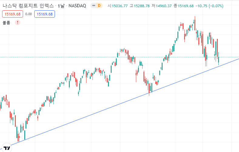 현재 나스닥 차트는 추세 지지선에 걸려있는 상태이며, 이 추세선이 무너진다면 추세의 변화로 받아들여도 좋을듯 하다.