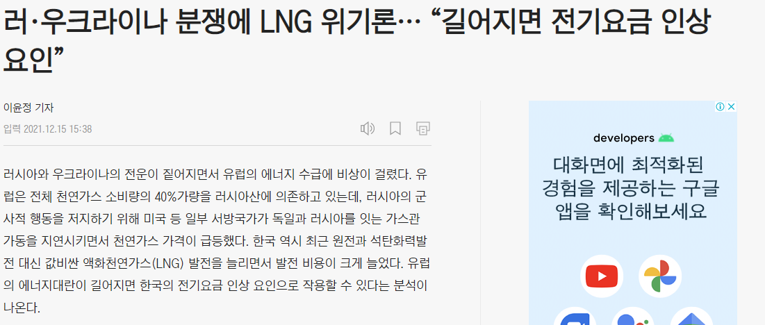 1. 현재 유럽은 러시아의 천연가스를 통해 대부분의 화력 에너지를 수급한다. 그러나 우크라이나의 편에 서게 된 EU는 정말 전쟁이 일어난다면, 제대로 된 천연가스의 수급을 받을 수 없을 것이다. 따라서 투자처는 천연가스 ETF가 될 수도 있겠지만, 나는 한번 더 꺾어서 한국조선해양이 투자하려고 한다. 왜냐하면 파이프라인으로 천연가스 수급을 할 수 없어진 유럽은 전적으로 해운을 통해 천연가스를 수급해야 하는데, LNG선 1위는 우리나라이기 때문이다.