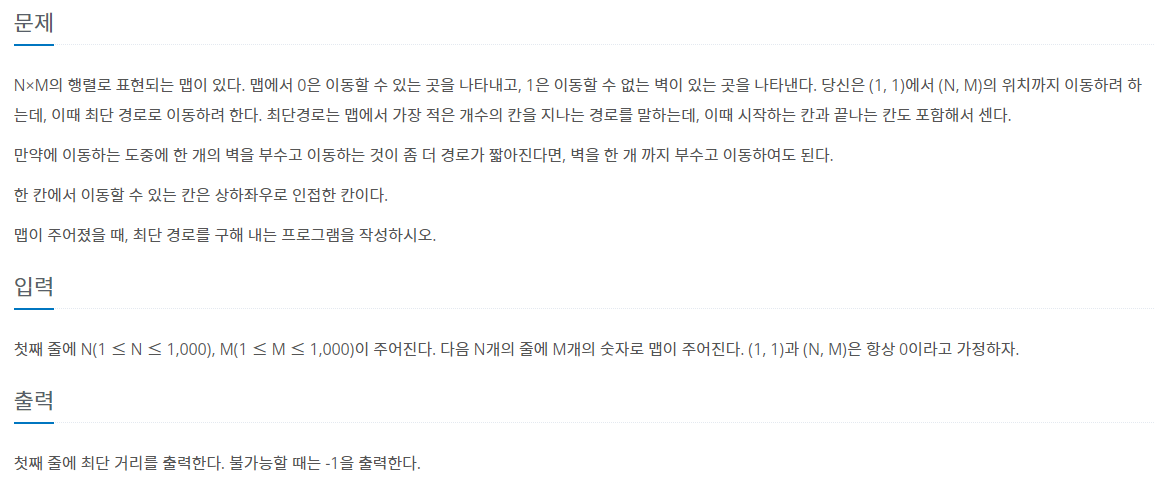 벽을 뚫었을 경우 3차원 배열을 이동시켜, 벽을 한번 뚫었다는 것을 체크해준다. z=0일때만 벽을 뚫을 수 있으므로, 단 한번 뚫을 수 있다. 이후부터는 bfs가 vismap을 갱신하며 최소거리가 마지막 값에 입력되게 된다.