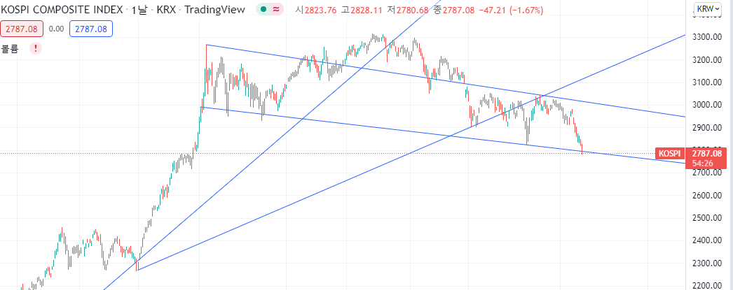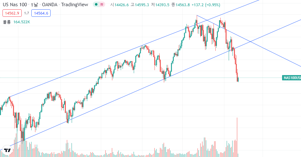 현재 나스닥은 추세 지지선은 뚫고내려갔으며, 200일선 역시 깨고 내려가서 금방 반등하긴 힘들 것으로 보인다.