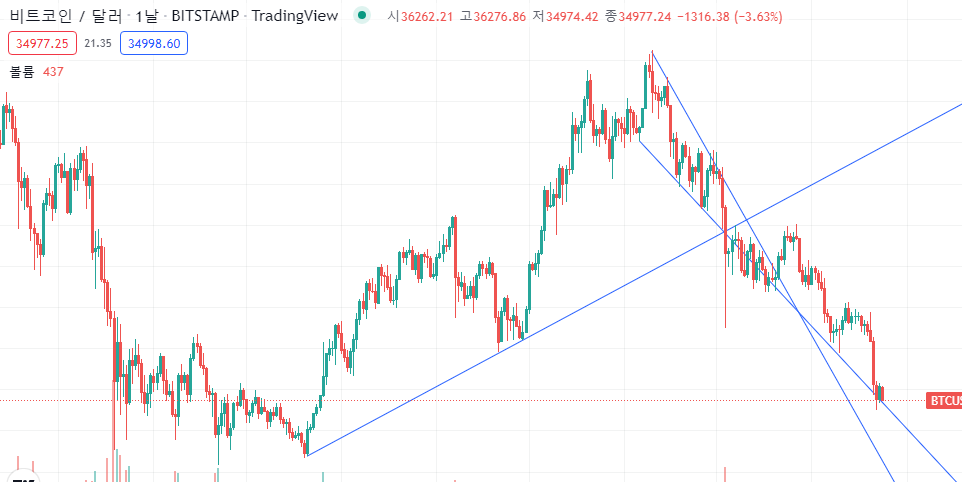 현재 비트코인은 추세지지선에 걸려있으나 여기를 깨고 내려가면 솔직히 다음 지지선은 어딜지 모르겠다.