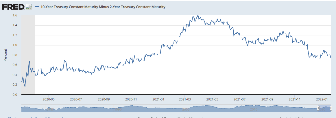 장단기 금리차가 좁혀지고 있다. 테이퍼링/양적긴축에 대한 반영으로 미국 2년물은 1%를 넘겼으며, 장기국채는 경기 둔화를 우려한듯 가격이 상승하고, 금리는 내려앉았다.
